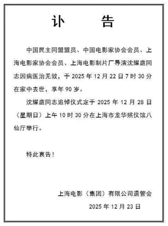讣告上显示,导演沈耀庭因病医治无效,于2025年12月22日7时30分在家中去世,享年90岁。