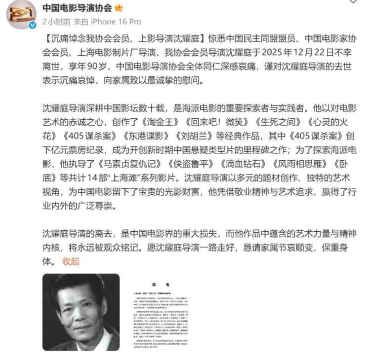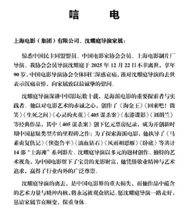 12月23日,中国电影导演协会发布消息:上影著名导演沈耀庭于2025年12月22日不幸离世,享年90岁,中国电影导演协会全体同仁深感哀痛,谨对沈耀庭导演的去世表示沉痛哀悼,向家属致以最诚挚的慰问。