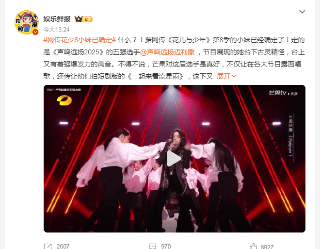 今日,传出《花儿与少年》第八季(花少8)“小妹”人选,目前爱配投资集中指向音乐综艺《声鸣远扬2025》的五强选手迈利撒(亦被称作麦丽萨)。不过,截至2026年1月13日,芒果TV官方尚未公布任何阵容信息。